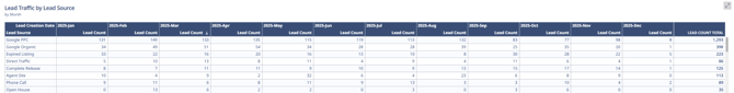 This table provides a granular breakdown of the origin of your leads for the year 2025. While the previous chart showed how many leads you got, this table explains where they came from.